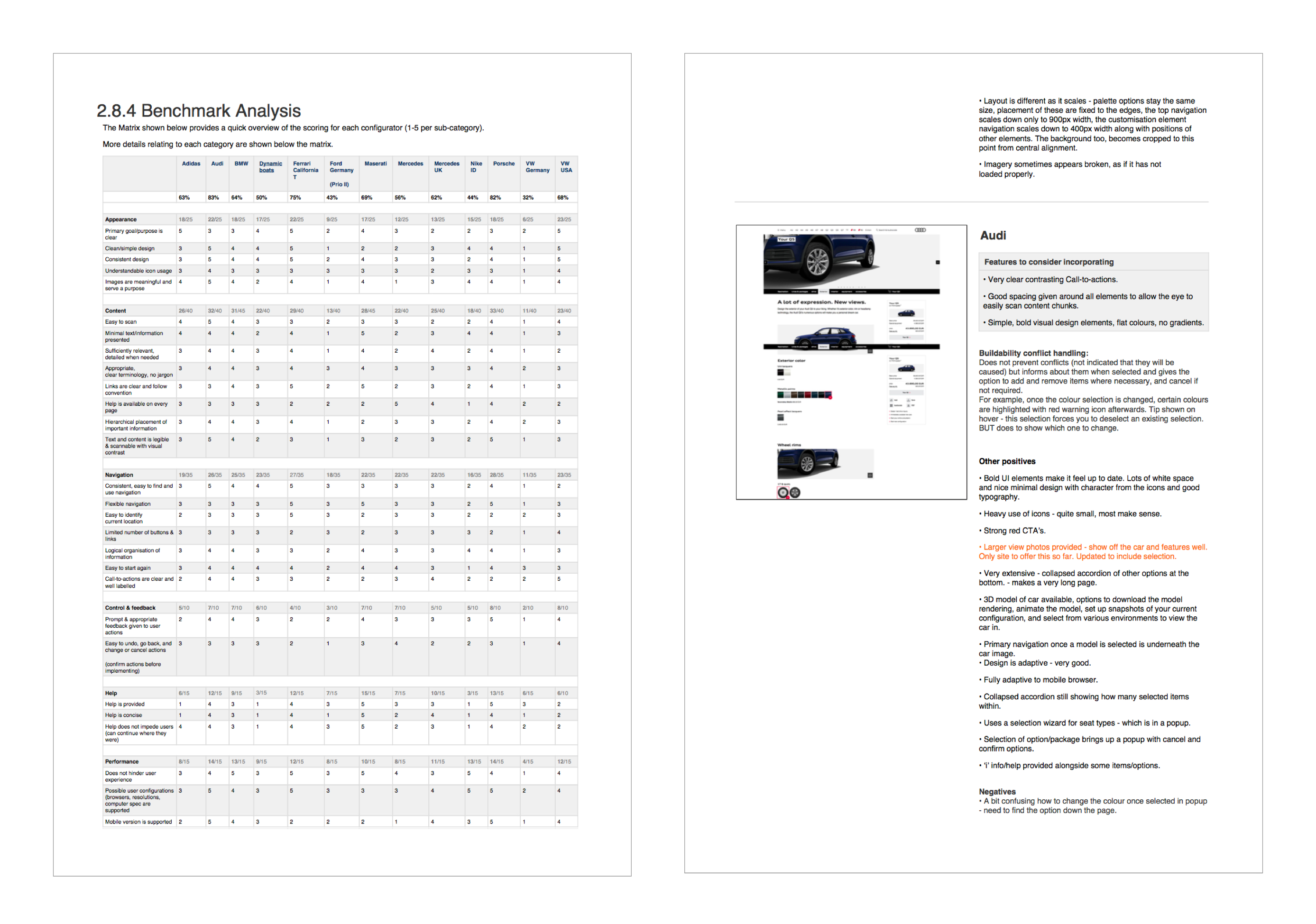 At the start of the project, I conducted research, benchmarking, and heuristic evaluations of primary competitors (Audi, Mercedes, Volkswagen), secondary competitors (Ferrari, Maserati), and surrogate products (Nike ID, Adidas) to address my knowledge gap in car configurators.