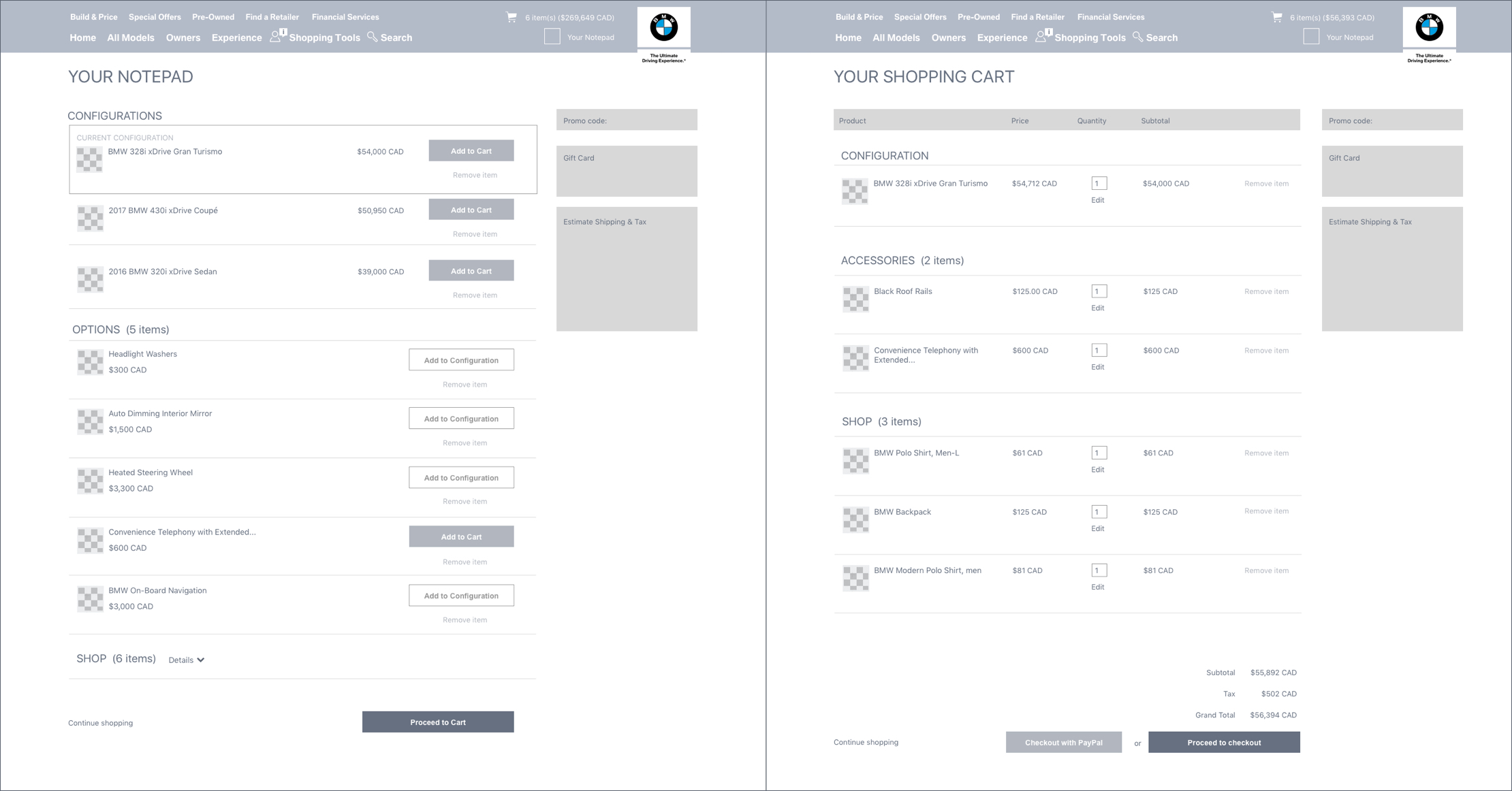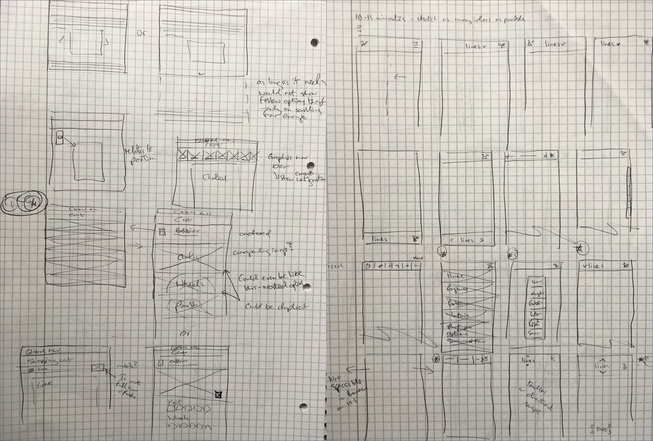 The client requested additional concepts for a global shopping cart and new global navigation. I worked independently on the shopping cart, creating sketches that quickly evolved into wireframes. These were presented, iterated on, and eventually put on hold as it became clear that the shopping cart was a separate project.